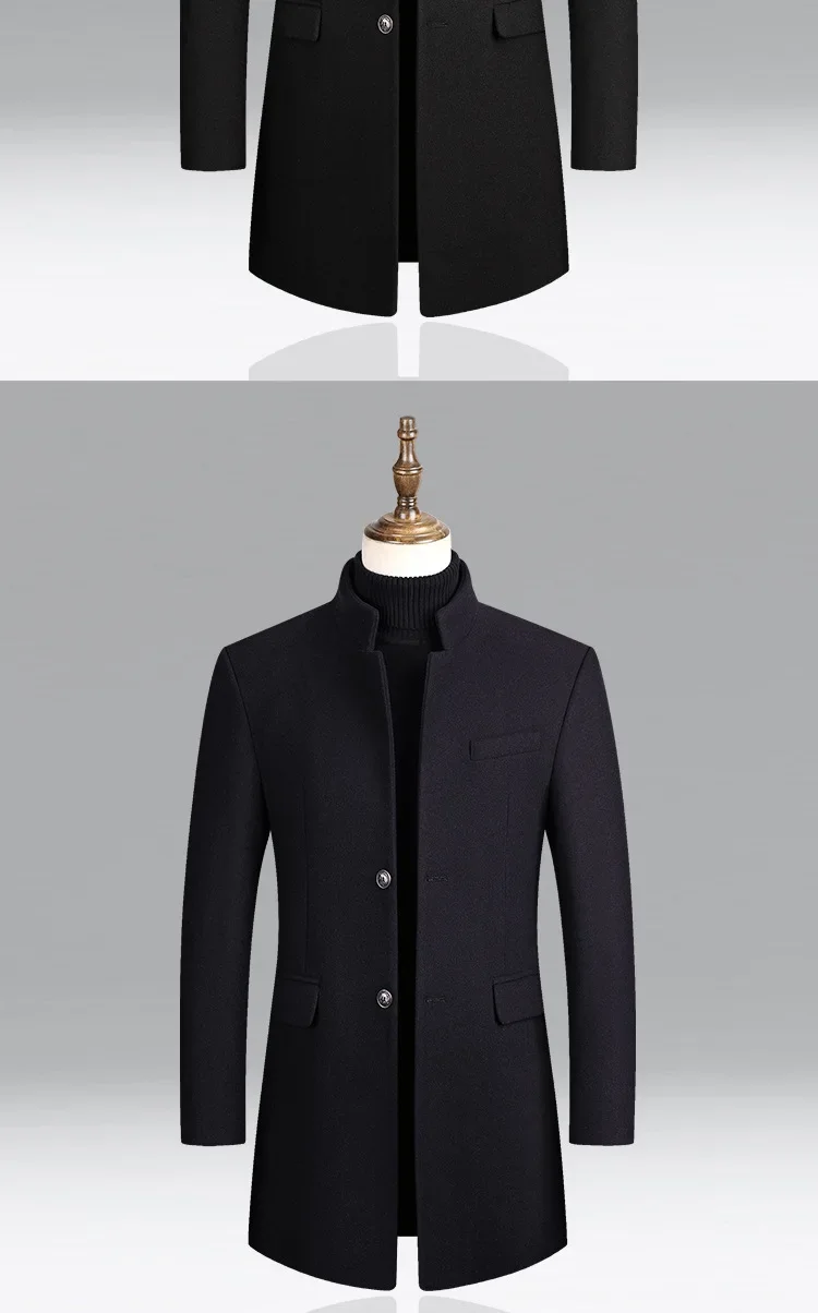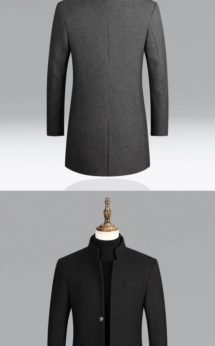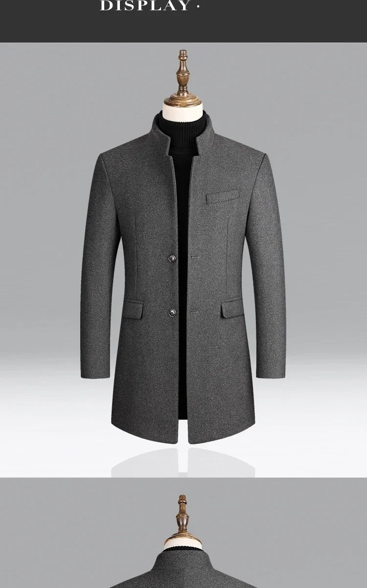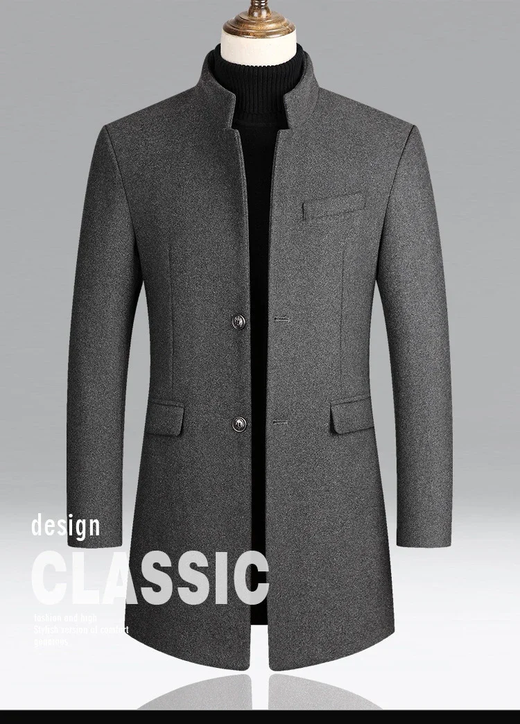 Material: 25% Wool, 63. 3% Polyester, 11. 4% OtherApplicable Scene: BusinessClosure Type: Single BreastedSleeve Style: RegularFabric Type: WoolenCollar: Mandarin Collar**Elegant Craftsmanship for Professional Settings**The BROWON Brand Business Casual Trench Coat is a testament to sophistication and style, designed to elevate your professional wardrobe. Crafted from a blend of 25% wool, 63.3% polyester, and 11.4% other fibers, this coat combines the durability and warmth of wool with the ease of care and versatility of polyester. The woolen fabric type ensures a classic feel that is perfect for business environments. **Tailored for Comfort and Style**The coat's design is both functional and fashionable. The single-breasted closure provides a secure fit, while the regular sleeve style offers a comfortable range of motion. The mandarin collar adds a touch of elegance, making this coat an ideal choice for both autumn and winter wear. The long clothing length offers ample coverage, ensuring you stay warm and stylish in cooler weather. **Adaptable and Versatile for the Modern Man**This BROWON wool coat is not just a garment; it's a statement piece that transcends seasons. It's a solid color coat that pairs effortlessly with various outfits, from business attire to casual wear. The absence of any decoration allows the coat to serve as a blank canvas, ready to be adorned with accessories or worn simply for its understated elegance. Whether you're attending a business meeting or enjoying a leisurely outing, this coat is designed to suit a variety of occasions and personal styles.